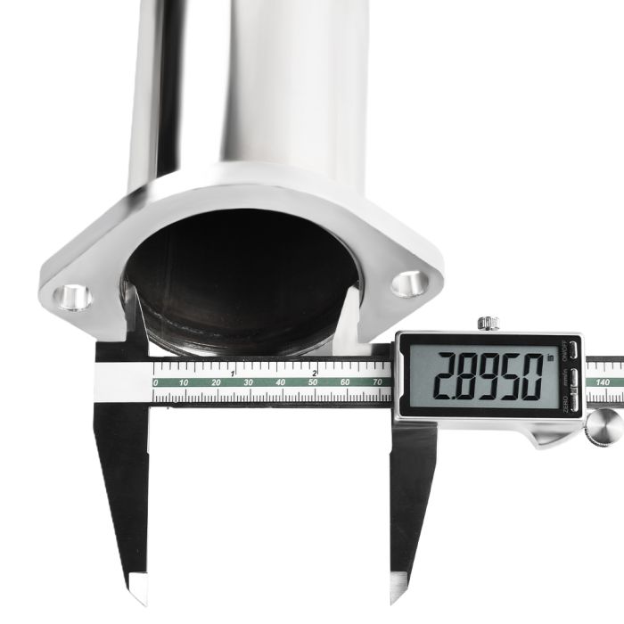 The Y-Pipe inlets are 2.5" and follow through with individual pipes until they converge at the Cat-Back system with a 3" Flat-Flange to provide a secure and tight seal every time.
