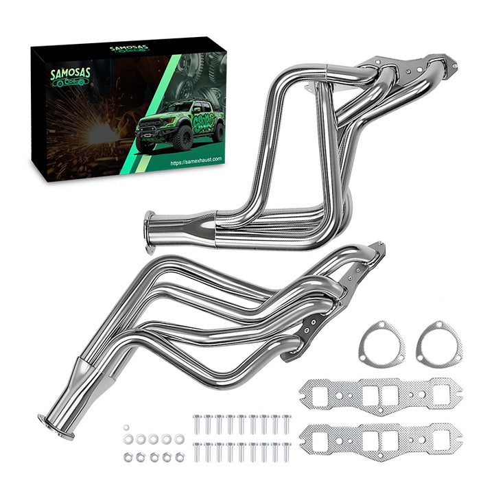 SAMexhaust headers are the perfect combination of quality and value. our exhaust headers made of high-quality T-304 stainless steel with CNC machine flanges of TIG and MIG welded construction. Computerized Mandrel-Bends bending maximizes the smoothest exhaust airflow for your vehicle and achieves better exhaust gas scavenging and reduced back pressure.